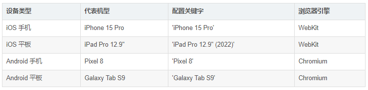 Playwright 内置 80+ 种预设设备配置,包含主流 iOS/Android 机型: