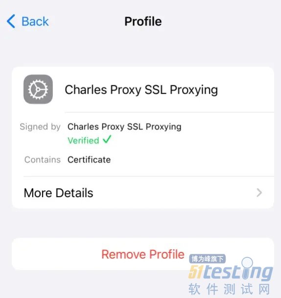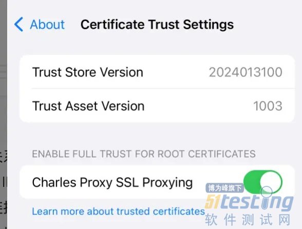6. 还需要在 setting -> general -> about -> certificate trust settings -> charles proxy ssl proxing 的开关打开。(图 6)